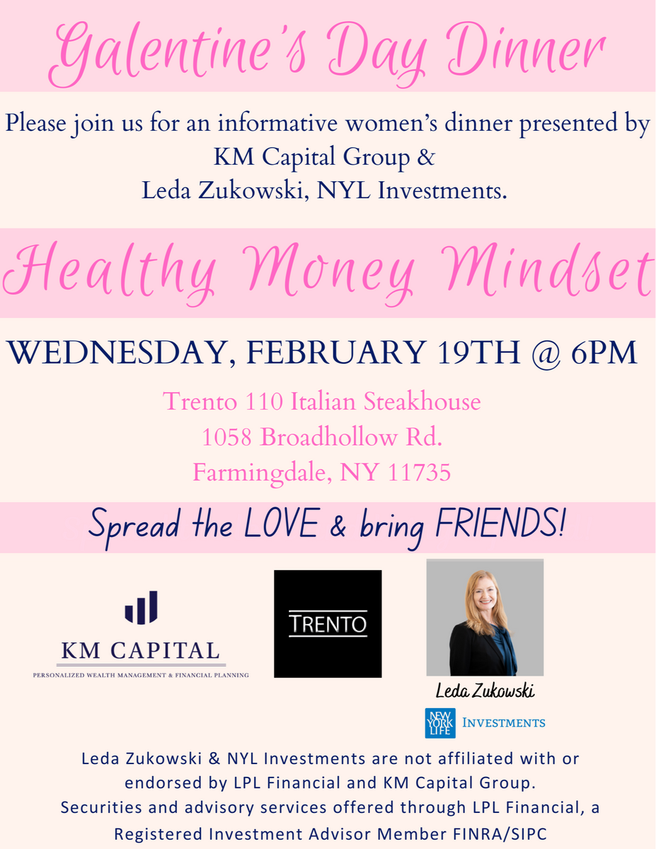 KM Capital Group & New York Life Investment invite you and your guests to Trento Italian Steakhouse for dinner and a presentation on Healthy Money Mindset - a women's discussion on investing, on Wednesday, February 19, 2025.