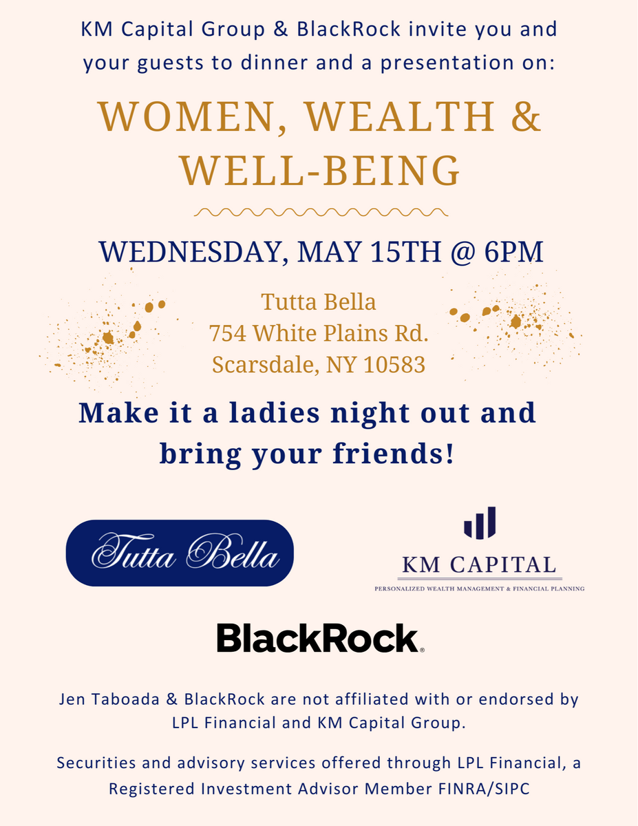 KM Capital Group & BlackRock invite you and your guests to Tutta Bella for dinner and a presentation on Women, Wealth & Well-being on Wednesday, May 15th at 6pm.